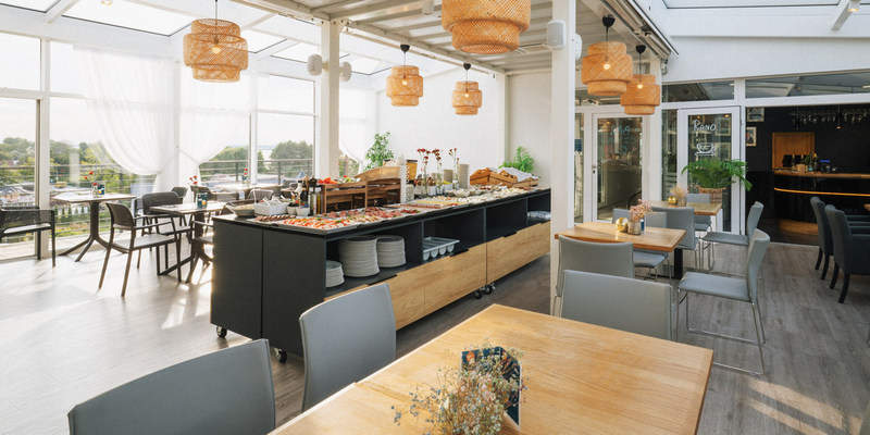 Śniadania w formie bufetu są serwowane od 8:00 do 11:00 na czwartym piętrze. Wybór jest naprawdę duży – od klasyków, takich jak jajecznica i parówki, po zdrowe opcje z owocami i jogurtami, a wszystko to oparte na regionalnych produktach. Posiłek można zjeść w jednej z dwóch sal lub na słonecznym tarasie.
