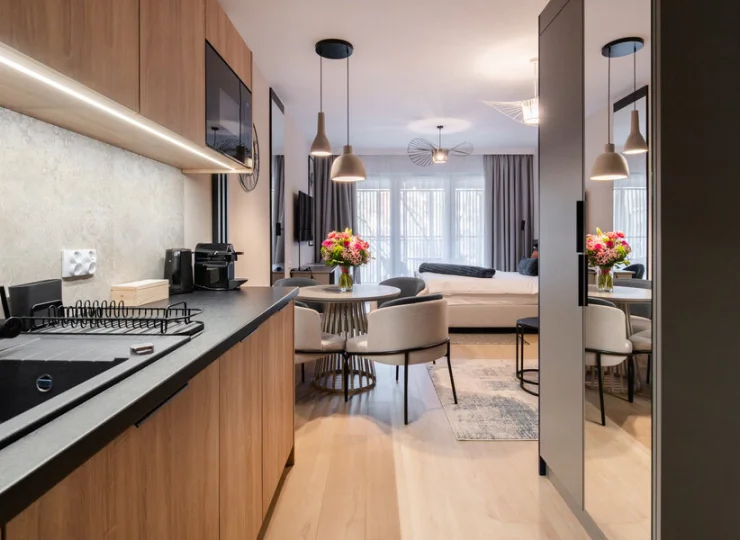 W nowoczesnym apartamentowcu mieszczą się komfortowe wnętrza z aneksami kuchennymi i balkonami. Przygotowano 2-osobowe pokoje oraz różne typy apartamentów, mogące pomieścić do 4 gości. W apartamentach jest część wypoczynkowa z rozkładaną sofą, na której mogą spać dwie osoby. W aneksach kuchennych zadbano o lodówkę, czajnik, płytę indukcyjną, naczynia i sztućce. Eleganckie łazienki wyposażono w kabiny prysznicowe, podświetlane lustra, suszarki do włosów, zestawy kosmetyków i miękkie ręczniki.