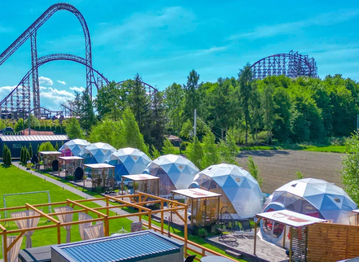 Domki są zlokalizowane na terenie pełnym nowoczesnej infrastruktury, zieleni i atrakcji. Goście nie będą mieli tu czasu na nudę. Znajduje się tutaj zewnętrzny basen kąpielowy z podgrzewaną wodą – idealny na upalne dni (czynny od kwietnia do końca września). Przy basenie rozstawiono leżaki pod parasolami. W strefie relaksu mieści się sauna, jacuzzi oraz ice tube, skąd można podziwiać najwyższe rollercoastery w Europie. Aktywni mogą grać w piłkę nożną lub badmintona oraz bezpłatnie wypożyczyć rowery. Na terenie ośrodka znajduje się strzeżony monitorowany parking - dostępny dla Gości obiektu przed i po zameldowaniu.